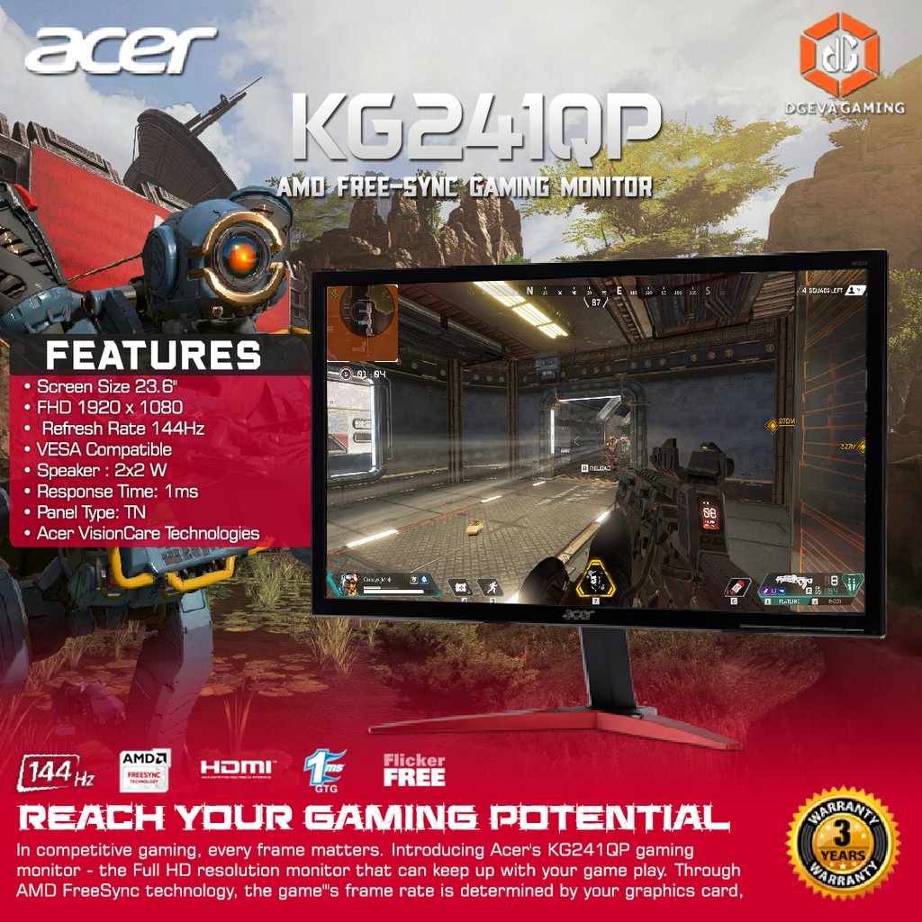 Acer Kg241qp 23 6 Inch 144hz Full Hd Amd Freesync Gaming Monitor Shopee Indonesia