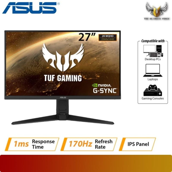 Tuf gaming vg27aq1a g sync compatible gaming monitor 27 inch wqhd 2560 x 1440 ips 170hz above 144hz 1ms mprt extreme low motion blur g sync compatible hdr 10 27 inch wqhd 2560 x 1440 ips gaming monitor with ultrafast 170 hz refresh rate designed for professional gamers and immersive gameplay.