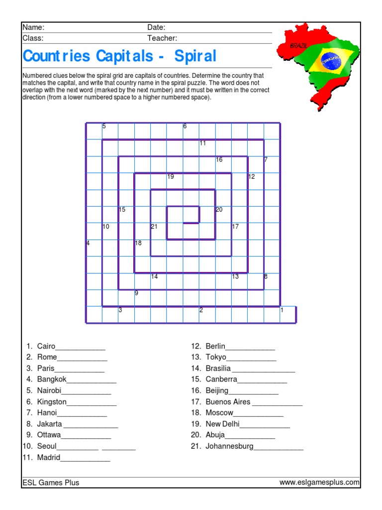 Countries Capitals Wordspiral Puzzles Games Of Mental Skill
